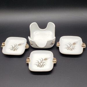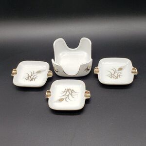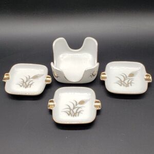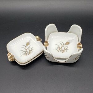 Lefton White Gold Wheat Design Vintage Personal Porcelain Ashtrays with Holder