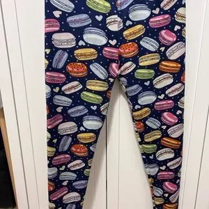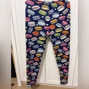 Warm leggings with cozy material inside size XL and cute macaroons pattern. $18. Worn only a few times.