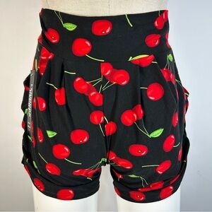 Bold cherry print on high waist shorts. Eye-catching and playful design.