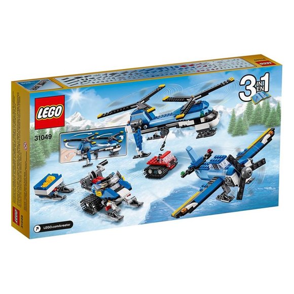 The 3-in-1 LEGO Creator Twin Spin Helicopter features a high-tech design with a light-blue and white color scheme and can be rebuilt to create a snowmobile with functioning winch or a single-engine airplane with spinning propeller.