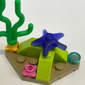 Lego Disney princess Ariel with a gate, treasure chest and rocks with plants.