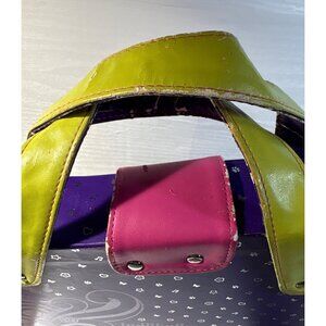 This durable carrying case features a vibrant purple and lime green design with a pink snap closure. Ideal for storage or organizing Lego pieces.