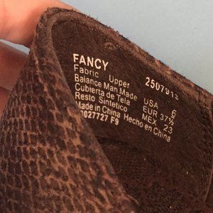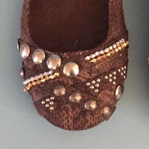 Ladies flats. Lei brand. Gently used only worn a few times. Brown snake skin print design with silver and gold colour accents. Steampunk look. side of one shoe is slightly bent from storage but does not affect wear.