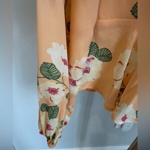 Charming blouse with floral print. Features V-neck and button front with sheer flowy sleeves. Small NWOT PTP 18 Length 22