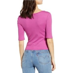 A deeply scooped neckline and elbow-length sleeves put this slim-fitting ribbed tee in a sassy class by itself.