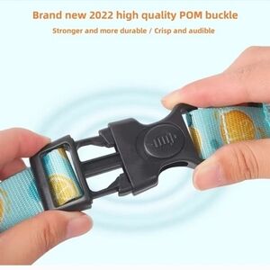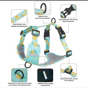 Adorable dog harness blue with lemons all over. Brand new, never used. This fits more of a medium to large than a small I would say. the clips are a good size compared to a small harness.