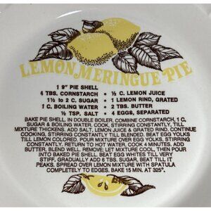 This USA-made ceramic pie dish features a classic Lemon Meringue Pie recipe on its surface. Its durable ceramic construction ensures even baking, while the vibrant cream, yellow, and brown design adds a touch of charm to your kitchen. A practical and decorative addition for baking enthusiasts.