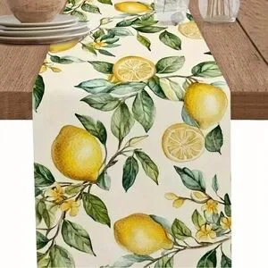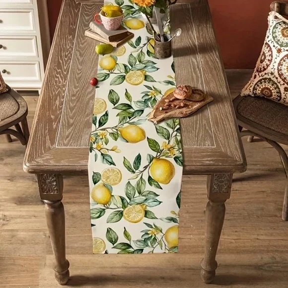 Bright lemon print table runner. Cream background with vibrant yellow lemons and green leaves. Fresh and cheerful kitchen accent. Easy to style with farmhouse or coastal decor.