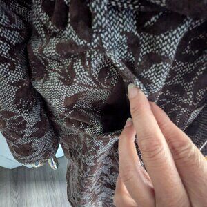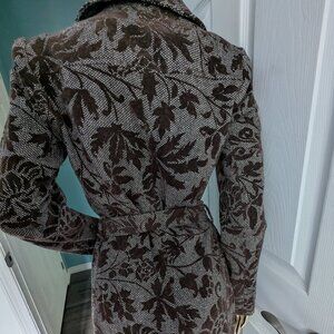 67% wool, 23% polyester, and 10% polyamide. Size 36 (size 6-8) Chest: 48 cm. Sleeve length: 64 cm and total length: 93 cm. Fine brown lining 100% polyester. Tied at the waist. 1 pocket on each side. Split at the back hem. 3 buttons at the front. Brown with leaf and flower patterns. Like new.