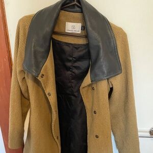 Beautiful locally/handmade deisgner (Winnipeg, Canada) fall coat by Lennard Taylor. Condition is very good. Only worn about a dozen times but it is too small for me now. Made from beautiful brown/tan wool. Large, deep pockets; fashionable black leather collar which can be worn up or down as shown in the photos. Length is midway through thighs on myself (5’4). Size is small/medium or US size 4/6.