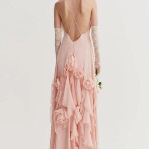 Meet Léonie—a heavenly new pink gown that makes an enchanting non-traditional bridal dress or a breathtaking bridesmaid dress. This floor-length satin gown features a ruffled plunging V neckline, flounce ruffles at the seams, and statement rosettes at the back skirt for an ethereal finish.