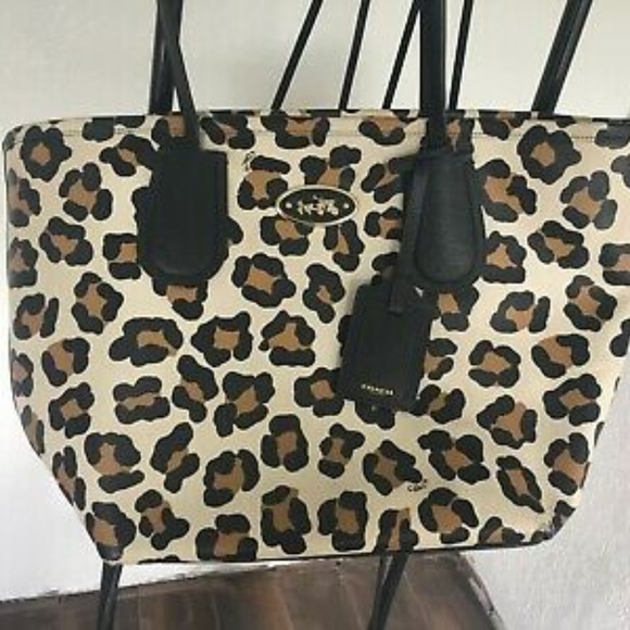 Description: Drawstring Carryall Black Multi-Color Signature Stripe Ocelot Leopard Print Fabric with Patent Leather Trim