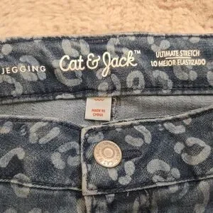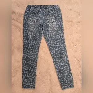 light blue super stretch leopard print denim leggings. factory fading. very flattering fit and pattern. faux zipper and front pockets design. two functional back pockets. size 16 but fits sizes 10+ well. (perhaps not a US 16) there are two inner buttons for a custom fit at waist. GUC. have been worn before. no rips, holes, stains, pilling or overstretched material. a couple of strings have come undone as shown in photo.
