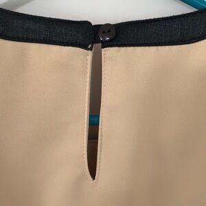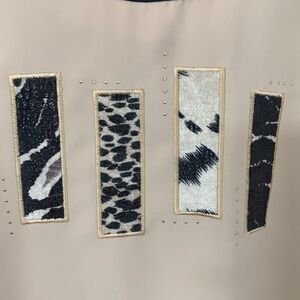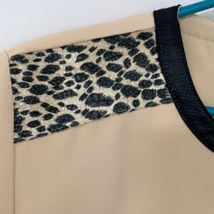 Stylish beige blouse with chic leopard print accents. Perfect for a trendy look.