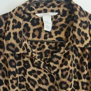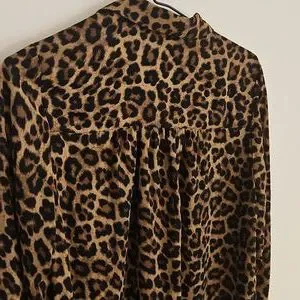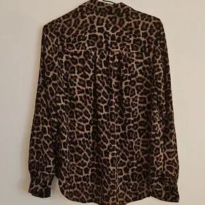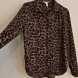 Stylish leopard print shirt by H&M. Features classic button-down design, button cuffs, and puckered detail across the shoulders for flowy look. size 4.
