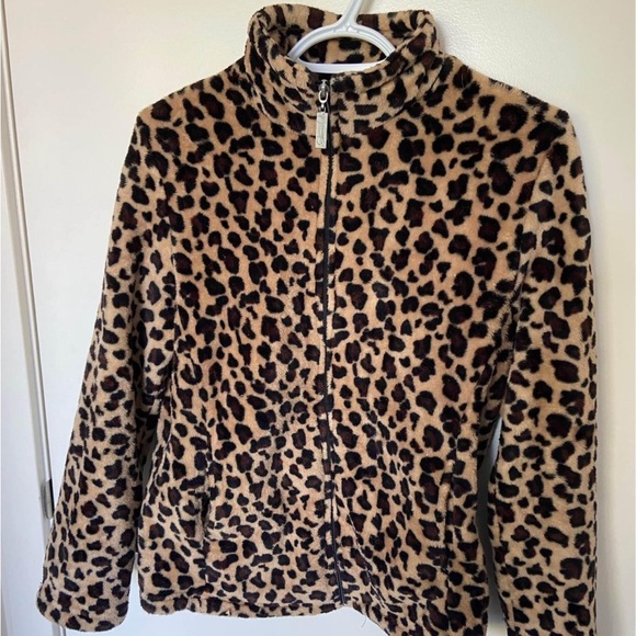 Stylish leopard print fleece jacket. Features a zip-up front and cozy design.