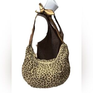 Stylish leopard print hobo bag featuring elegant gold accents. Perfect for adding a touch of wild sophistication to any outfit.