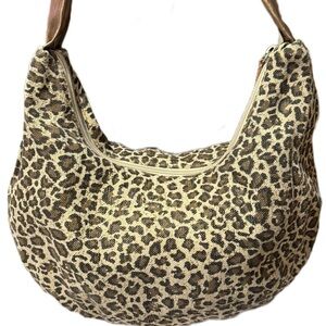 Stylish leopard print hobo bag featuring elegant gold accents. Perfect for adding a touch of wild sophistication to any outfit.