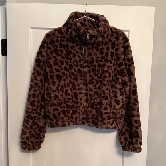 Stylish and cozy leopard print cropped fuzzy jacket. Perfect for keeping warm and fashionable.