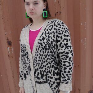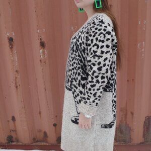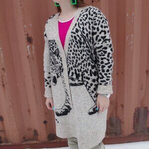 Women's leopard print face on women's cardigan sweater. size large 73% polyester 2% spandex 25% acrylic. In good condition .cream and black color