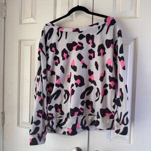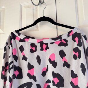 Bold and fun SHEIN women’s top featuring an allover gray, black, and hot pink leopard print design. Made with a relaxed fit and lightweight stretch fabric, this top offers comfort with a trendy statement look. Wide neckline, long sleeves, and casual pullover style make it perfect for pairing with jeans, leggings, or skirts.