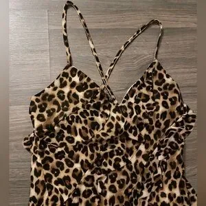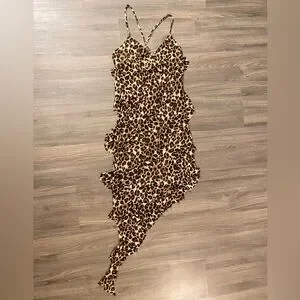 Leopard print ruffle dress with adjustable straps and hanging fabric for dramatic look. Brand new with tags as well!!🥰