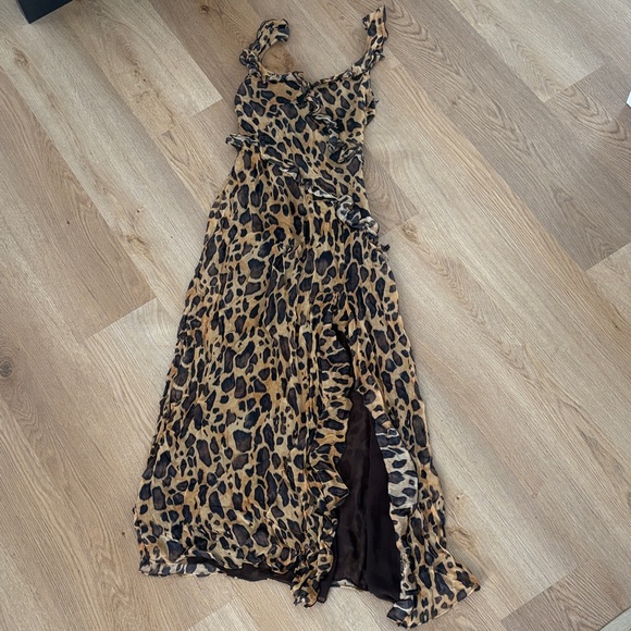 Stylish leopard print maxi dress with ruffle details, leg slit for extra flair, and side zipper.