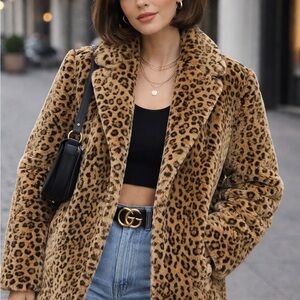 Chic and cozy teddy jacket with bold animal print. Perfect for a stylish look.