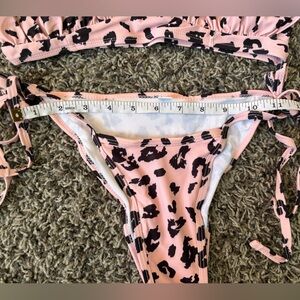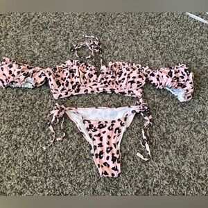 Stylish bikini with a leopard print. Features a halter top and tye bottoms. Perfect for beach days.