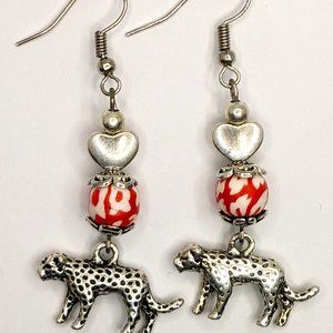 Silver heart earrings with clay bead and pewter leopard, a unique blend of elegance and wildlife-inspired charm. Hand made in South Africa