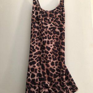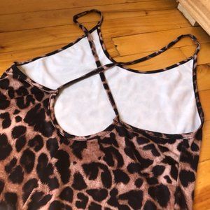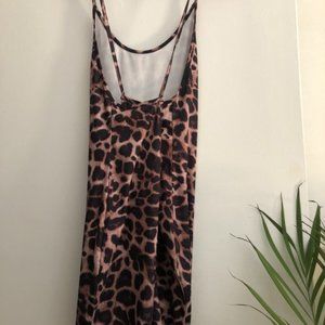 Leopard print biker jumpsuit featuring crossed shoulder straps and stretchy material.