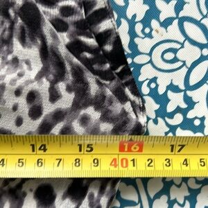 Leopard print mesh top. Has double mesh for less sheer. Ruffle front and black mesh trim at neckline. Cap shoulder. Measured unstretched and can stretch another 2”. Excellent condition.