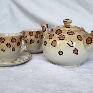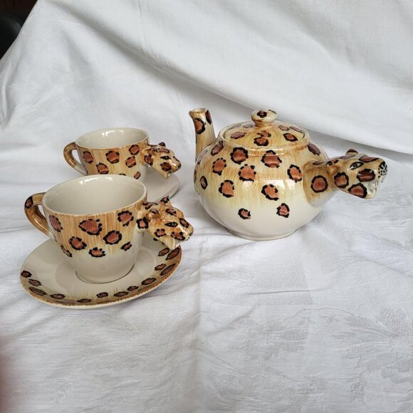Teapot and two teacups and saucers shaped like leopards (or jaguars?).