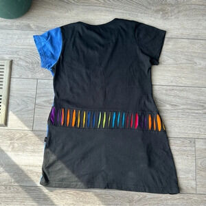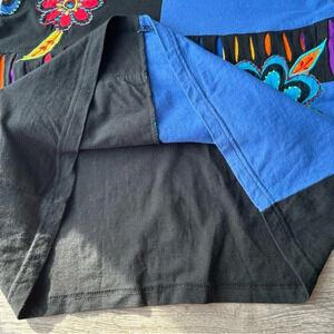This stylish tunic features beautiful leopard and rose embroidered patchwork that is sure to turn heads! The unique asymmetrical hem gives the piece a modern contemporary look.