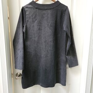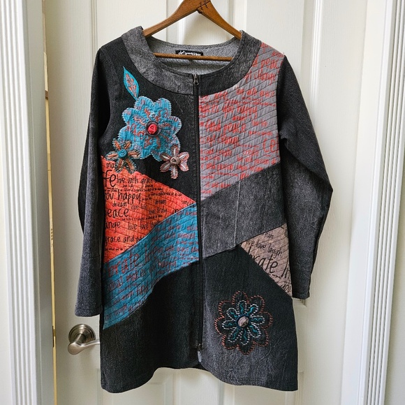 The perfect seasonal transition jacket. Leopards & Roses is a very unique handcrafted brand. Beautiful embellishment. Background colour is a dark gray-denim. A very generous size small. Overall length from back of neck 31 1/2 inches. Sleeve length 19 1/2 inches. Side seams at bust 23 1/2 inches. Side pockets. and scoop neck.