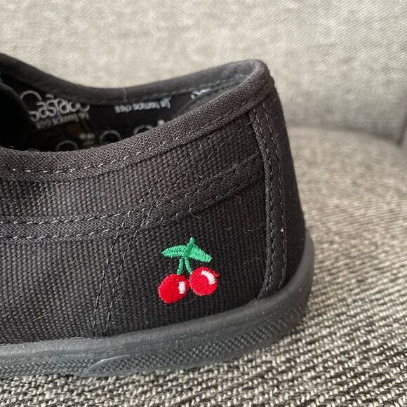 Low profile, neat black lightweight canvas shoes in black mono. In my pics the rubber looks grey, but it is black! The cherry details on the shoe add a touch of whimsy.