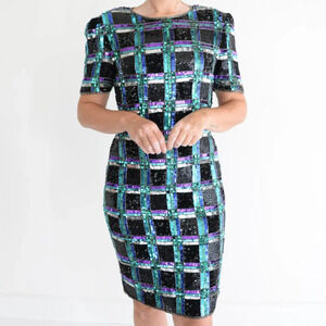 Leslie Fay Black w Purple Teal Sequin Evenings Short Sleeve Shift Midi Dress 8