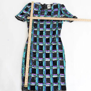 Leslie Fay Black w Purple Teal Sequin Evenings Short Sleeve Shift Midi Dress 8