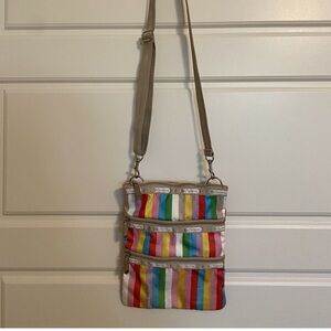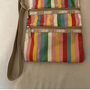This Lesportsac mini bag features a lively striped design in red and pink, making it a standout accessory. The adjustable strap adds convenience while the colorful pattern ensures it complements a variety of outfits.