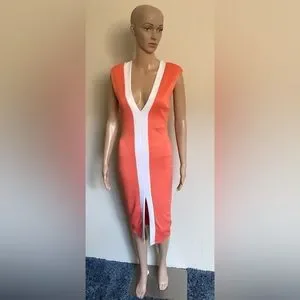 Salmon Figure Hugging Dress with White Accents at Neckline and down the Middle of the Bodice. Cap Sleeves. Plunging V Neckline. Light Shoulder Pads