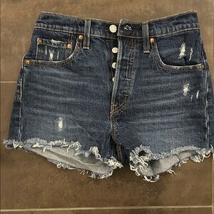 Keywords: Levi's, 501, cutoff, denim, shorts, light wash, distressed, frayed hem, vintage, summer, casual, festival, streetwear, iconic