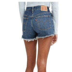 Mid-rise denim jean short from Levi's with a frayed, cutoff hem. Rigid denim cut in a slim, curve-skimming fit with a medium vintage wash + button fly. 5-pocket design with signature Levi’s detailing at the back.