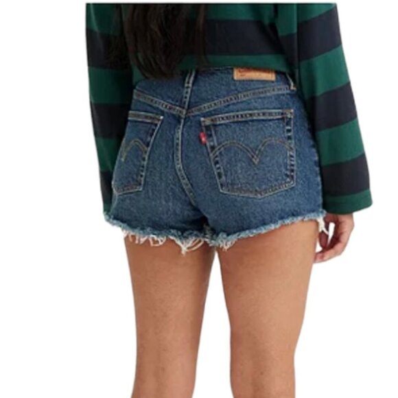 High waisted denim jean short from Levi's with a frayed, cutoff hem. Rigid denim cut in a slim, curve-skimming fit with a medium vintage wash + button fly. 5-pocket design with signature Levi’s detailing at the back.