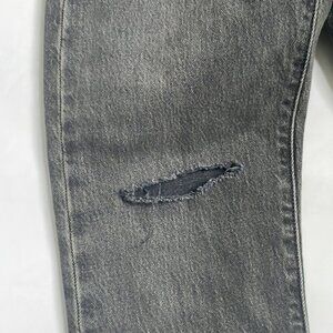 Levi's 501 high-rise skinny jeans with a button fly. Fitted through the hip and thigh with a skinny leg opening. Size 24/28. Features intentional distressing at the pocket and hem, and a hole at the knee.