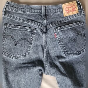 Trendy denim jeans with a button-fly design. Features a classic blue color.