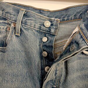 These Levi's were cropped into capri pant length. Distressing at front upper thigh area. Button row closure. No stretch.