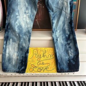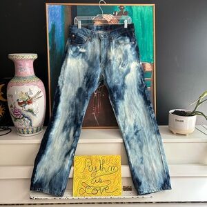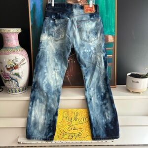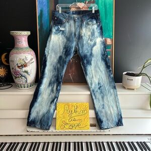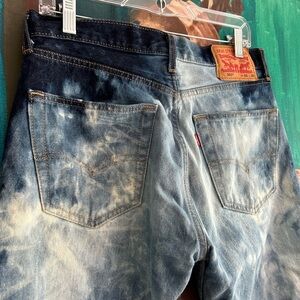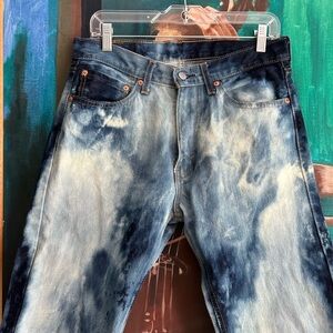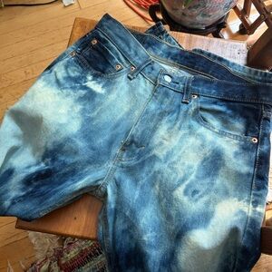 Bold Levi's jeans with a striking blue tie-dye pattern. Perfect for casual outings. Ti dye Bleached.