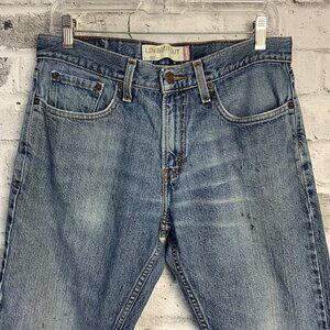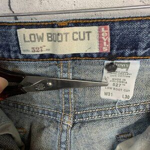 Levi's 527 Bootcut Distressed Low Boot Cut Denim Jeans are a pair of men's jeans made of cotton denim fabric with a medium-light wash. They feature a 5-pocket design with a coin pocket, a zip closure, and button and zipper accents with a Levi's logo. The jeans have a regular fit with a mid-rise and a bootcut style. They come in a solid blue color and have a length of 30 inches. The Levi's 527 series jeans are machine washable and are suitable for winter, summer, fall, and spring.