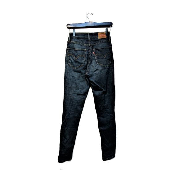 Dark denim levis 721 high rise skinny jeans. These beauties are nice and stretchy and size 26. There's a bit of pulling across the front (see photo) and they are priced accordingly.