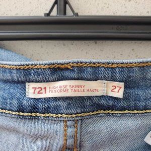 Levi's 721 High Rise Skinny Jeans with distressed hem. 27 inch waist, 25 inch inseam, 10 inch rise. Some wear to the belt loops as shown in photos. Reposhing since they're shorter than I expected.